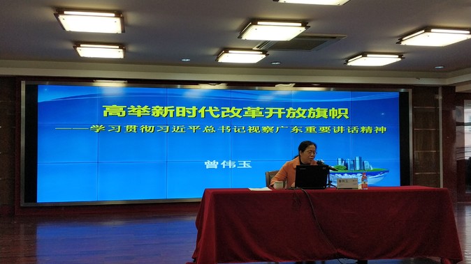 曾伟玉作了主题为《高举新时代改革开放旗帜》的辅导报告。她指出,习近平总书记亲临广东视察指导并发表重要讲话,高度评价改革开放40年来广东取得的成绩和创造的经验,为广东和广州未来改革开放提出了根本遵循、指明了前进方面。她着重从深刻认识重大意义,增强学习贯彻的自觉性坚定性;认真总结成功经验,把改革开放旗帜举得更高;全面领会核心内涵,牢牢掌握改革发展主动权等三个方面,阐述了习近平总书记重要讲话精神。