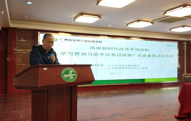 2019年1月7日下午,我校举行学习贯彻习近平总书记视察广东重要讲话精神专题报告会,邀请广州市委宣传部副部长,广州市社科联党组书记、主席曾伟玉同志做专题报告。会议由学校党委书记卢景超同志主持,近300余名教职工参加了报告会,4000余名学生通过网络直播收看了报告会。